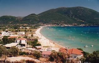| Die Station liegt in einer wunderschönen ca. 2,5 km breiten und 16 km langen Bucht, in der Nähe von dem kleinen Örtchen Vassiliki (schwer zu erkennen vor dem Berg). In dem Ort kann man am Abend in den verschiedenen Lokalen gut essen und in der Zeus-Bar seinen Durst bei guter Musik stillen. Die Station liegt direkt am Surfhotel Margelis und nur ein paar Meter vom Wasser entfernt. Der Wind kommt sideshore von rechts ab ca 13:00 Uhr mit 4-6 bft. In der Bucht gibt es eine lokale Thermik die verantwortlich ist für den angenehmen Gleitwind. | ![]() |