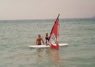auch diesmal nicht ausgereicht, um die Halse richtig fahren zu können. Sobald man aus dem Wasser kommt, sollten "Barfußfahrer" Badeschlappen griffbereit haben. Der Kieselstrand ist so grob, dass das Gehen ohne Schuhe schmerzlich ist. Auch fehlten für die Sonnenschirme entsprechende Ständer. Ab 4 bft mußten die provisorisch aufgestellten Sonnenschirme zusammen geklappt werden, oder sie flogen davon. |