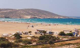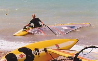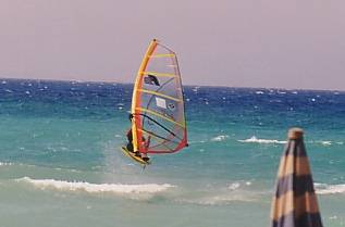 | Der Meltemi sorgt für die richtige Power im Segel. Die Windwahrscheinlichkeit über 4 bft. liegt in den Sommermonaten bei ca. 70 %. Leider hatte der Wind in unserem Urlaubszeitraum einen Durchhänger. Der Wind war nicht so stark und deshalb war die meißt gefahrende Segelgröße 6 m². Der Wind weht sideshore von links mit kleiner Welle im Uferbereich und Dünungswelle weiter draußen. Hier fühlen sich Fortgeschrittene und Welleneinsteiger so richtig wohl. Der Stehbereich im Wasser ist sehr schmal und liegt nur bei ca. 4 Meter. | ![]() |